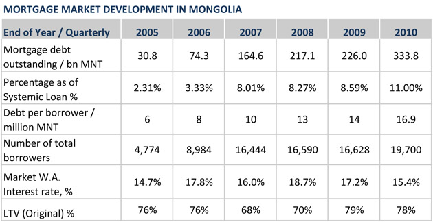 Mongolia has a total of 15 commercial banks of which 9 banks issue mortgage loans. Since 2003, outstanding mortgage loans increased by a factor of close to 40.